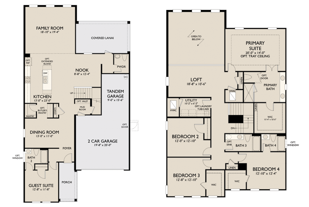 The popular Duval II plan features a large kitchen with island and breakfast nook anchoring the open main floor, while a second-floor loft overlooks the family room below. The private primary suite, first-floor guest suite, optional butler's pantry, and tandem garage space add convenience and luxury to this spacious plan.